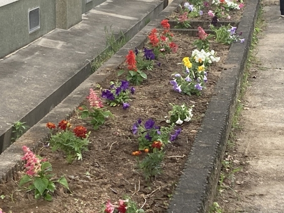 5月20日(火)に生活委員とボランティアの生徒で花苗植えをしました。先週、草取りをし整備した花壇に、花の苗を植えていきました。暑い中、多くの生徒が参加して委員長も満足気な顔でした。多くの花の色や香りで皆さんに心地よい気分をもたらしてくれることでしょう。