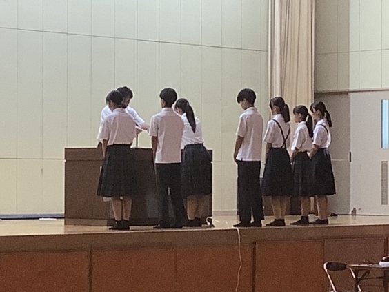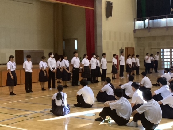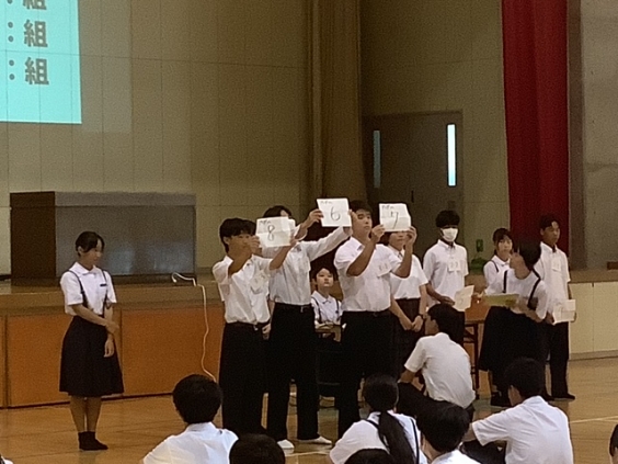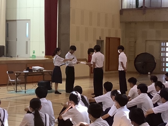 10月14日(火)全校集会で市内、地区新人各種大会の表彰、保健委員会の表彰、そして合唱コンクールの実行委員の紹介とプログラム抽選会が行われました。音楽の時間では、金賞目指し、クラス合唱の練習に取り組んでいるところです。当日は、生徒たちの協力する力や思いを込めて歌い上げる姿を見せてくれることと思います。