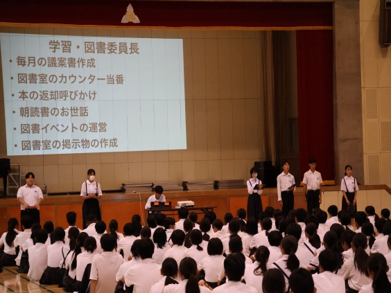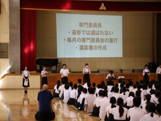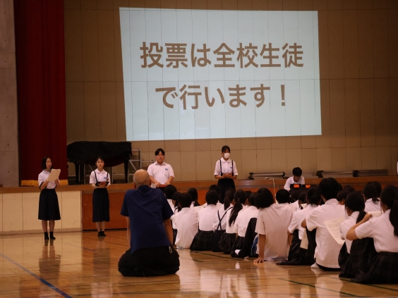 10月17日(金)生徒会役員選挙に向けて、現生徒会役員が生徒会三役や専門委員長の仕事内容、選挙方法を説明しました。1、2年生は話を聞き、生徒会活動への参加のあり方を考えました。来週から選挙立候補者の受付が開始されます。