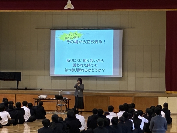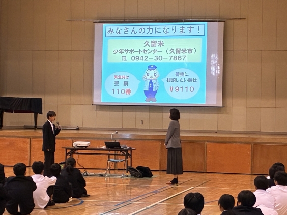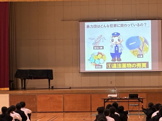 11月21日(金)福岡県警 黒木雅子様を講師に迎え、暴力団排除教室行われました。暴力団が関わっている犯罪として、違法薬物の売買と闇バイト(強盗・詐欺)を挙げられました。これらの犯罪の多くはSNSを利用して行われています。SNS上で知り合う人をどこまで信用するのかをよく考え、慎重に行動してほしいと話されました。