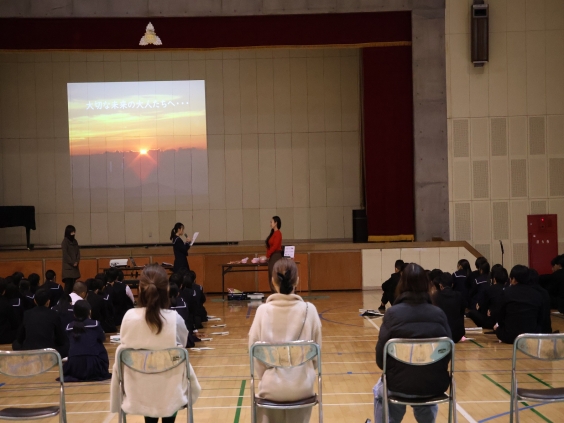12月9日(火)3年生対象に、性に関する学習「いのちと性のお話し会」を行いました。講師の山下百子先生(助産師)から、「妊娠や出産、誕生について」「性的な接触に伴う責任について」「生まれる命の大切さについて」という3つの視点から、実体験や動画などを交えながら話をして頂きました。子どもたちは、うなずきながら関心を持って聞き、時には近くの友だちと意見交換をしました。3年生の保護者の方にもご参加いただきました。性について、命について深く考える貴重な時間でした。