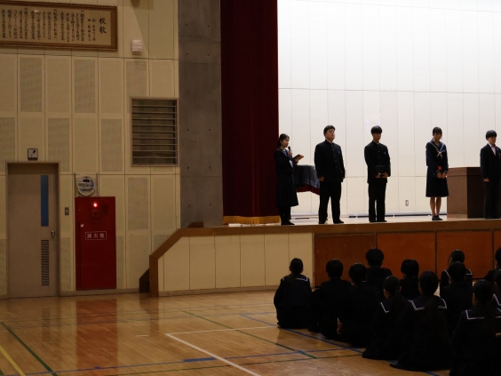 12月24日(水)2学期終業式が行われました。校長先生から、2学期は学校行事が多かったがリーダーや生徒会の頑張り、さらに周りの皆さんの協力の頑張りがよく見られたこと、学習面では3年生は自分の進路に向けて、1,2年生はこれまでの学習を振り返り定着させるように冬休みを有意義に活用してほしいと話がありました。 全校集会では、生徒会役員の退任のあいさつがありました。自分の成長や周囲への感謝など思いのこもったあいさつでした。1年間お疲れさまでした。