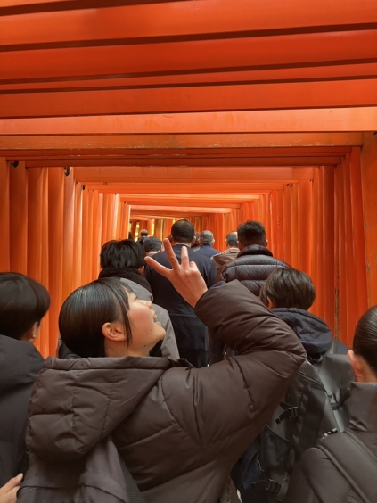 2日目は京都市内の自主研修でした。班で事前に計画を立てた金閣寺や清水寺、伏見稲荷などをバスや地下鉄を利用しながら班で協力して見学しました。途中で、外国人に英語で大牟田市を紹介するメッセージカードを渡したりしました。試行錯誤しながらでしたが、全員無事ホテルに戻ってくることができました。とても貴重な体験をすることができた一日でした。