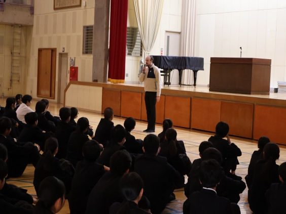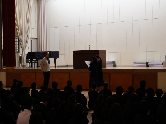 また、今年度で退任されるトーマス先生へ、感謝を込めて生徒会長が代表で表彰状を贈呈しました。これまでの楽しい英語の授業や、昼休みに一緒にサッカーをして過ごしたかけがえのない時間に、心からの感謝を伝えました。別れは寂しくなりますが、最後は全員でトーマス先生の新たな旅立ちを祝福しました。