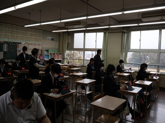 3月18日(水)、2年生を対象に「全国学力・学習状況調査(英語)」の事前検証を実施しました。 本調査はタブレットとヘッドセットを活用し、音声を聞き取ったり、マイクに向かって解答を録音したりする形式で行われます。来年度4月の本番に向け、生徒たちは真剣な表情で操作手順を確認していました。 いよいよ最高学年となる2年生(新3年生)の皆さん、日頃の学習成果を存分に発揮できるよう応援しています。