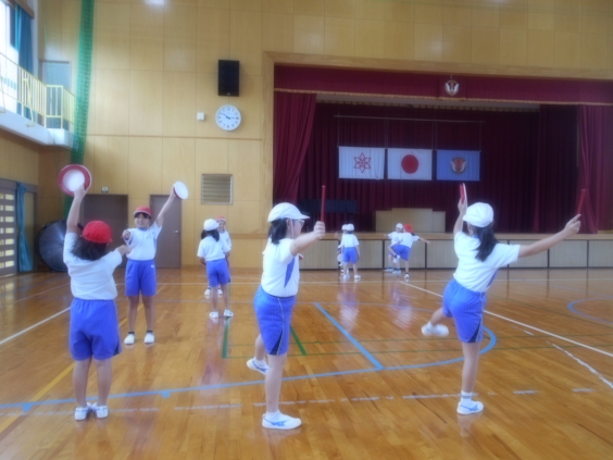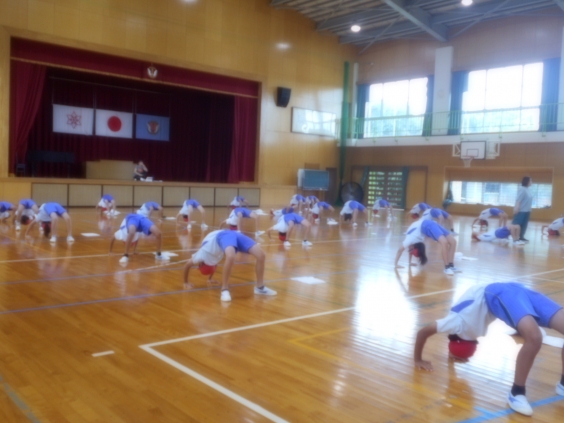 いよいよ運動会の表現の練習が全学年で始まりました。低学年は早くから練習を始めていたので、現在は動きを確実にしようとしているところです。中学年はエイサーの踊りを4年生から3年生へ伝授しています。高学年は1人技の水平バランスやブリッジ、肩倒立等がきれいにできるようにがんばっているところです。これから10月18日の本番に向けて少しずつ完成させていきます。お楽しみに。