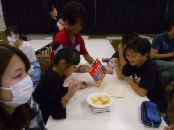 昨日、5年生はカルビーの方に来てもらい、おやつの適量や資源の再利用について親子で学習しました。1日のおやつの目安量は200kcal。ポテトチップスだと35gということで35gを量り取ったり、パッケージから原材料や栄養成分などの情報を読み取ったりしました。またリサイクルゲームを通して、製造過程でどんなごみが出て、どのようにリサイクルされているかを知りました。親子で一緒に学んだことでこれからの健康な生活にきっと活かすことができるでしょう。