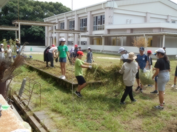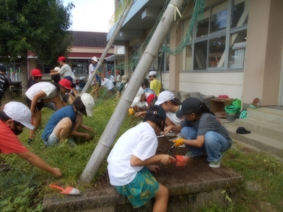 雑草が生い茂り、木々の枝が鬱蒼としていた学校の広場や花壇が、先週の児童による除草作業や本日の退職校長会による剪定作業で見違えるほどすっきりきれいになりました。本日は退職校長会より奥薗和司元校長先生(天の原小)をはじめ、11名の元校長先生が来てくださり、体育館前のソテツの剪定や東側の学校敷地へ伸びてきている枝の剪定、運動場東側の遊具周りや南門周りの雑草・雑木刈り等をしていただいています。11名の元校長先生方、暑い中の作業、ありがとうございました。
