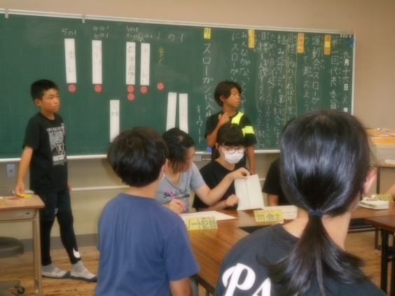 19日(金)代表委員会を開き、今年の運動会スローガンが決まりました。各学年から本年度の学校の重点目標「目標に向かってねばり強く取り組む子どもの育成」を意識して、スローガンに入れたい言葉が集まってきていました。協議の結果、1,2年生の「全力」3年生の「最後の最後まで」4,6年生の「心を一つに」5年生の「楽しむ」6年生の「あきらめない」をもらって、『最後の最後まであきらめず、心を一つに全力で楽しむ運動会』と決定しました。各学年の意見を取り入れるのはとても難しかったと思うのですが、代表委員会に出席した児童がうまく活かしてまとめてくれました。今年の運動会はこのスローガン達成に向けてがんばります。お楽しみに。