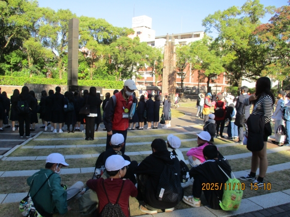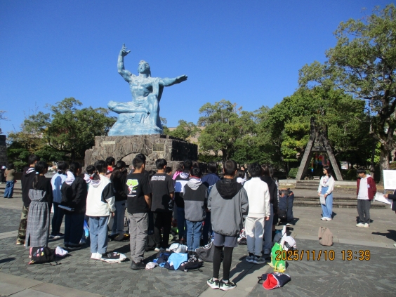 11月10日・11日に6年生が長崎へ修学旅行に行きました。お天気に恵まれ学び多い有意義な2日間でした。1日目は平和学習を行いました。原爆資料館の展示物を見たり戦争体験者の方の講話を聴いたり、さるくガイドさんと浦上地区の戦争遺構を回って説明を受けたりして、戦争の恐ろしさや悲惨さを心に刻みました。講話で話された大切にしてほしい3つのこと(自他の命を大事にする。命の尊さは皆一緒、差別をしない。話合いで解決する。)や2つの心(絶対反対という強い心と弱い人を守るという優しい心)を忘れず、今の平和を守れるように努力していきましょう。
