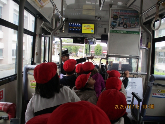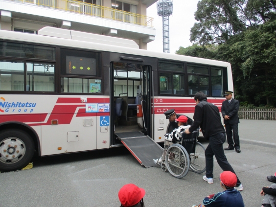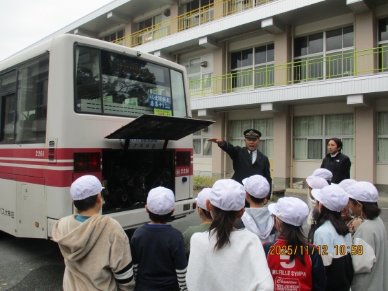 11月19日1,2年生は生活科の学習でバスを利用して大牟田動物園へ行きます。そこで12日に西鉄バスの方からバス教室を実施していただきました。バスの外を観察してバスの長さや高さ、重さ、タイヤの大きさや数、鏡の数等について、中に入って乗降の仕方や料金の見方、乗車人数等について学びました。前のタイヤが1本ずつなのに対して、後ろのタイヤは2本ずつ、なぜでしょうと尋ねられ、しっかり考えた子供達でした。答えは後部の方が乗客も多くエンジンルームもあるので重く、それを支えるためということでした。後部のエンジンルームや車いすの乗降の仕方等も見せてもらい、新たな発見に子供達もとても喜んでいました。