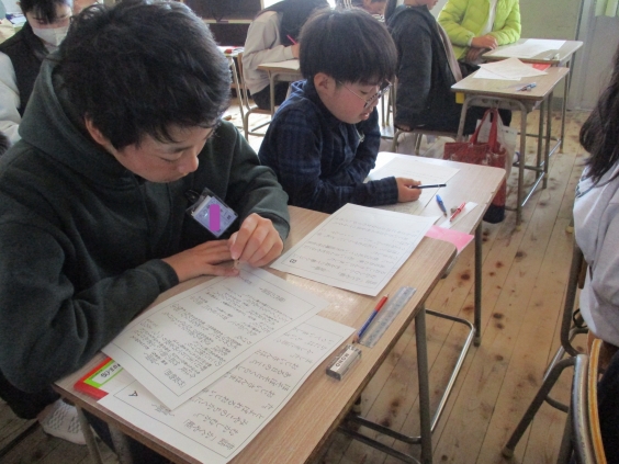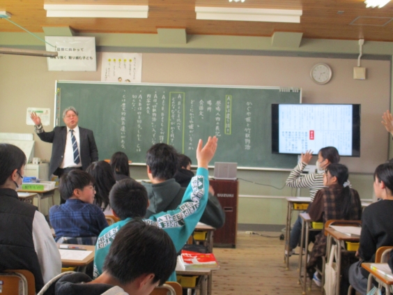 本日、宮原中学校の原校長先生が国語の出前授業をしてくださいました。「冒頭の場面に隠されているなぞを見つけよう」というめあてで、現代文「かぐや姫」A・Bと古文「竹取物語」Cの教材文を比べて、違いを明らかにしていきました。語句や内容の違いを見つけることで、作者が加筆した内容に気付くことを教えていただきました。校長先生と一緒にA、B、Cの教材文を音読しながら、楽しく思考した1時間でした。6年生は中学校の授業を思い描きながら授業を受けたことでしょう。原校長先生、貴重な授業をありがとうございました。
