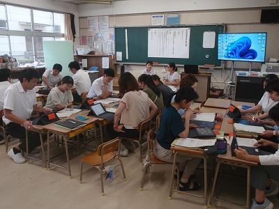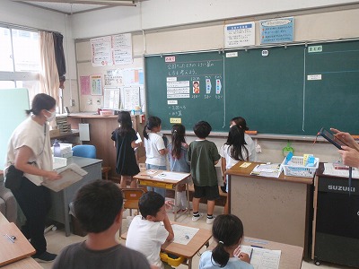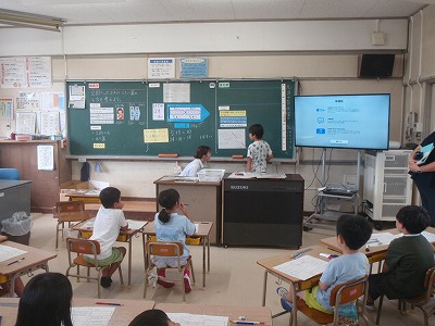 17日(水)に2年2組で算数「見方・考え方をふかめよう(2)」の授業研究会がありました。はじめ持っていた色紙24枚から、昨日5枚使い、今日5枚使うと色紙は何枚になるかを求める問題です。「使いました」という文から、ひき算になることや2回減っていることに気付きました。自分で2回減った時の計算の仕方を考え、友達と考えを話し合いました。順に計算するのではなく5+5=10、24−10=14という考えが出ました。ひき算ではなくなぜたし算?と問われ、減った数をまとめて計算するとよいことをとらえることができました。放課後は、今回の授業について職員で成果や課題、改善点について協議をし、一人一人のこれからの授業づくりを考える機会となりました。