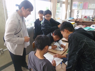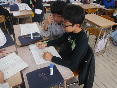 11月5日(水)に6年3組で算数「図形の拡大と縮小」の授業研究会がありました。いつでも拡大図と縮図の関係になる図形はあるかを考える問題です。二等辺三角形、正三角形、長方形、正方形、ひし形、正五角形で考えました。辺の長さの比や角の大きさが等しいかで確かめました。結果、拡大図と縮図の関係になっているものは、正三角形、正方形、正五角形で、なっていないのが、二等辺三角形、長方形、ひし形になりました。さらに話し合いを進め、正多角形はいつでも拡大図と縮図の関係になることを理解することができました。次は、学んだことを日常生活に生かすため、縮図を利用して実際の大きさを求める活動を計画しています。