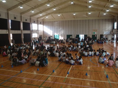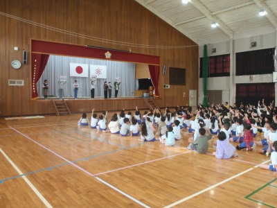 11月6日(木)に笑顔・交流委員会の発表がありました。最初に、ありがとうメッセージについての説明がありました。次に、イントロクイズをしました。曲を流し、何の曲かを3択で選びます。正解した子たちは笑顔になっていました。一番盛り上がったのは「猛獣狩りに行こうよ」でした。委員会の子ども達がステージ上でお手本を示してくれました。「ゴリラ」と言われたら、ゴリラは3文字ですから3人で集まりその場に座ります。最後は10文字だったので集まるのが大変でしたが、そろった時は嬉しそうでした。笑顔交流委員会の皆さんのおかげでたくさんの笑顔が見られました。ありがとうございました。