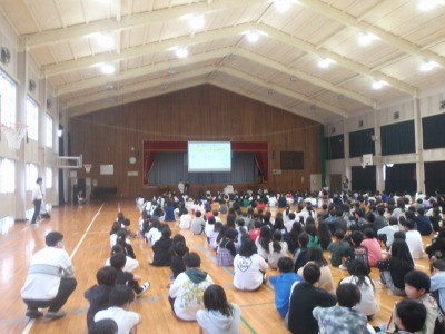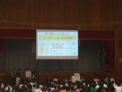 11月10日(月)に読書集会を行いました。先生たちや図書委員のおすすめ図書の紹介をクイズ形式で行いました。準備をしてくれた図書委員会の皆さんありがとうございました。10日(月)から21日(金)まで秋の読書旬間です。1〜3年生は、もぎもぎ読書や読書迷路があります。4〜6年生は、読書ビンゴがあります。これを機会に、いつもとは違う視点からの本に触れ、読書への意欲が高まることを願っています。