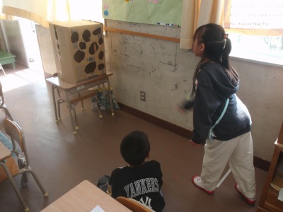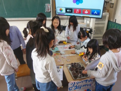 11月25日(火)に生活科「あきの おもちゃをつくろう」の学習で、1年生の秋祭り(1組と2組合同)を行いました。けん玉、ドングリ飛ばし、魚釣り、松ぼっくりツリー作り、迷路、的あてなどのお店がありました。お店グループとお客グループに分れて楽しむことができました。ドングリや松ぼっくりを使ったおもちゃもあり、秋を感じることができました。