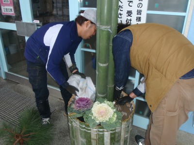 昨日、お父さんクラブの皆さんと門松を作りました。朝8時に集合し、竹を取りに行くところから始めました。銀水太鼓に使う竹も一緒に取りました。竹を切り組み立てました。完成したのは昼になりましたが、立派な門松ができました。職員玄関前に飾っていますので、学校に来られた際はぜひご覧ください。朝早くより門松づくりをしていただいお父さんクラブの皆さん、ありがとうございました.