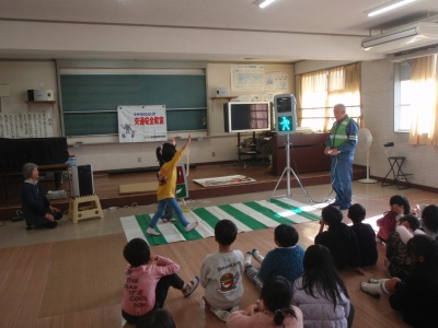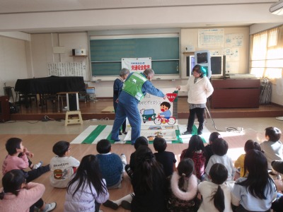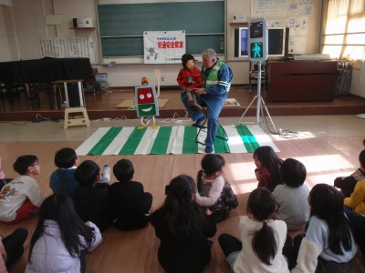 令和7年12月22日(月)23日(火)の2日間、1・2年生を対象に交通安全教室がありました。講師として、信号電材株式会社の福田正春様をお迎えし、ご指導していただきました。犬の「のんちゃん」、男の子の「たっちゃん」と腹話術をされ、子ども達はとても楽しく横断歩道の渡り方を学ぶことができました。ご指導いただいた福田様、2日間ありがとうございました。