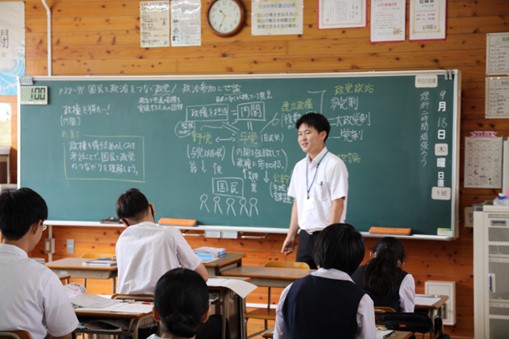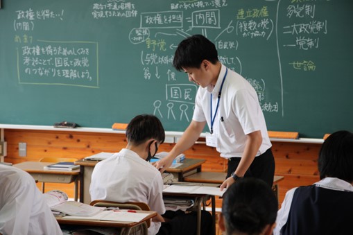 教育実習生 兼行 祥允さん(平成31年白光中卒)の授業の様子です。 3年社会(公民分野)の様子です。 民主政治は国民が主権者であり、国民の意見を政治に反映するために、どのような制度をしているかを学習しています。指導担当の先生からの指導の下、ペアでの話し合い活動を取り入れた授業に取り組んでいました。