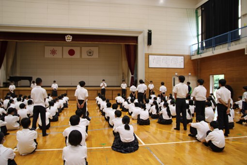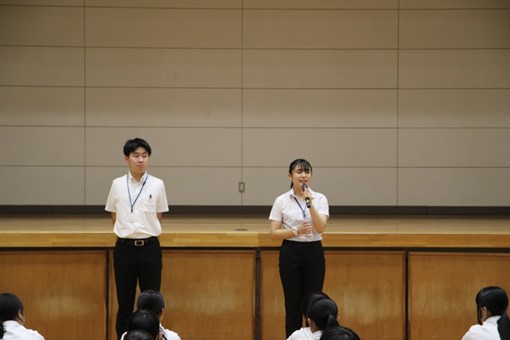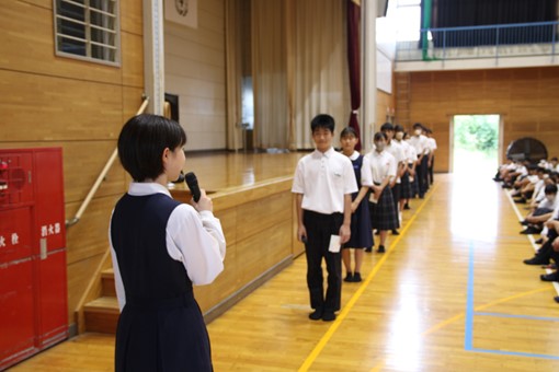 9月22日(月)全校集会の様子です。 9月26日から新人大会が始まります。 各部の部長が新人大会に対する意気込みを発表しました。 それを受け、井形生徒会長が激励のことばを伝えました。 最後に、二週間の教育実習を終えた金子・兼行先生から お別れのことばを頂きました。白光中での思い出を忘れず、 来年度からの教師生活頑張ってください。