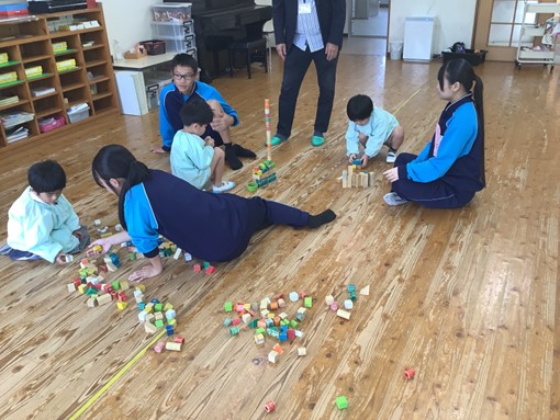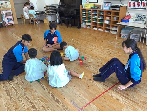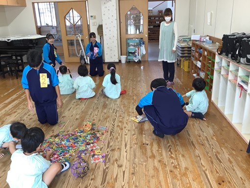 10月23日(木) 3年生総合的な学習の時間で保育実習を行いました。 目的は ・保育に携わる方々の姿にふれ、実際に子どもたちとかかわることで、幼児を理解すると共に、これまで自分を育ててくれた人の気持ちを考える機会とする。 ・社会の一員としての礼儀やマナーの大切さを知る。 です。6個所の施設にお世話になりました。 今回は、光圓寺保育園の様子です。