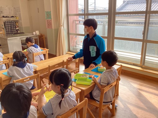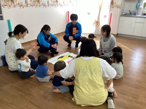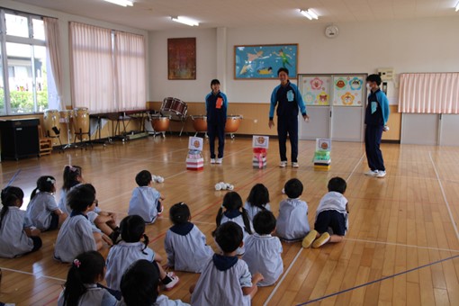 10月23日(木) 3年生総合的な学習の時間で保育実習を行いました。 目的は ・保育に携わる方々の姿にふれ、実際に子どもたちとかかわることで、幼児を理解すると共に、これまで自分を育ててくれた人の気持ちを考える機会とする。 ・社会の一員としての礼儀やマナーの大切さを知る。 です。6個所の施設にお世話になりました。 今回は、日の出保育所の様子です。