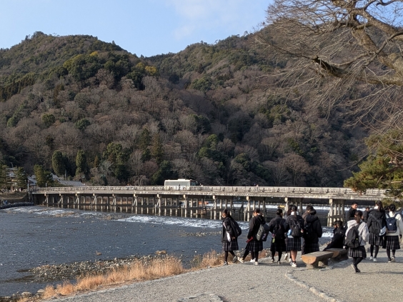 修学旅行3日目は、まず旅館の退所式を行い、旅館の方にお礼を伝えました。その後、朝食をとり、嵐山散策に向かいました。嵐山では見学の時間を2時間取ることができたので、ゆっくりと見学することができました。土産屋や食事の店が多く、みんな土産を買ったり食べ歩きを楽しんだりしていたようです。天龍寺、野宮神社、竹林の小径などを見学している生徒もいました。