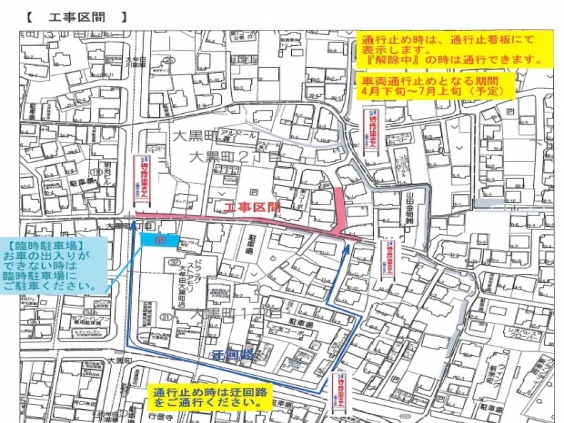 通学路で上水道工事が行われますのでお知らせします。 大黒町のドラッグストアモリがある大黒町2丁目の信号から 本校西門へ向けて約150mの区間で工事が行われます。 工事期間 令和8年4月中旬から令和8年7月下旬(予定) 工事時間 午前9時〜午後5時 工事に伴い、道路幅が狭いため、生徒には気をつけて通る ようご家庭でもご指導宜しくお願いします。