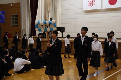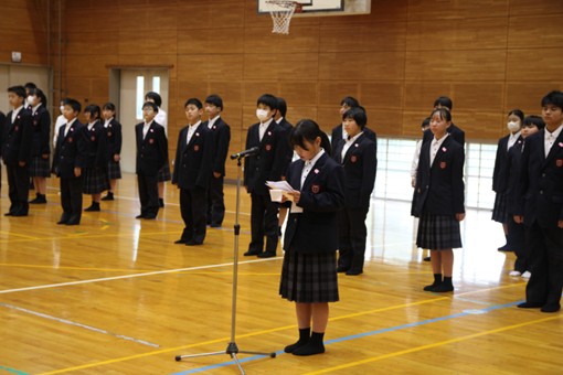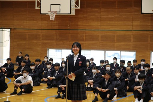 4月13日(月) 5限目に対面式を行いました。 2・3年生の拍手の中、行進しました。 生徒会長の石橋さんの歓迎の言葉の後、 1年生の税所さんが代表の挨拶をしました。 1年生の皆さん早く中学校生活に慣れて 下さい。