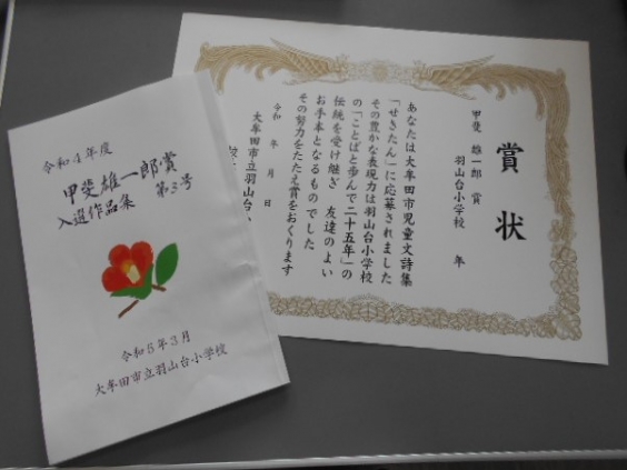 本校は、本年度で創立三十九年目となりました。開校以来、国語教育に取り組んでいます。平成4年、福岡県教育委員会研究指定校として国語の授業研究を進めるにあたって、筑波大学の甲斐雄一郎先生のご指導を頂きました。令和2年度より、甲斐先生への感謝の気持ちを込めて、本校の子供達が綴った作文・詩の中から作品を選定し、「甲斐雄一郎賞」として作品集にまとめています。第3号の作品集ができあがりましたので、本日、「甲斐雄一郎賞」に選ばれた1年生から5年生の表彰式を行いました。