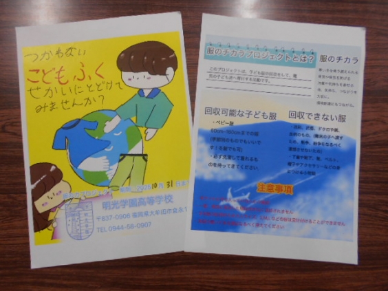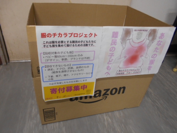 先日、明光学園の生徒さん二人が説明に来てくれました。本日、協力依頼の手紙を配付しています。9月24日(水)から10月末日までの約1ヶ月、羽山台小の玄関に段ボールを置いていますので、使用しなくなった服を入れてください。お子さんに持たせてもらっても大丈夫です。ご協力をよろしくお願いします。