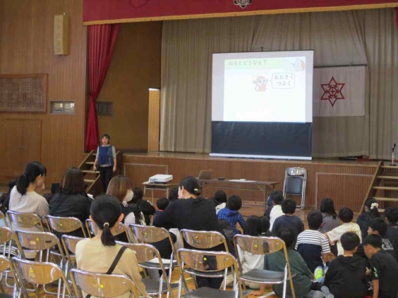 「子供とメディア」から講師をお招きし、ゲームやスマホについての規範意識教育を親子で受けました。「道具を使うには道具のことを知り、しかも自分の生活を豊かにするために使うべきです。」という話から学習がスタートしました。子供たちの健康を守るために、「食べる・遊ぶ・寝る」ことが大切であること、見えない相手と繋がる裏には危険が潜んでいること、直接コミュニケーションをとることが大切であること等を詳しく話していただきました。また、今は依存症やゲーム障害、イヤホン難聴や近視が急増していることも教えていただき、子供たちの健康が脅かされていることにドキッとしました。