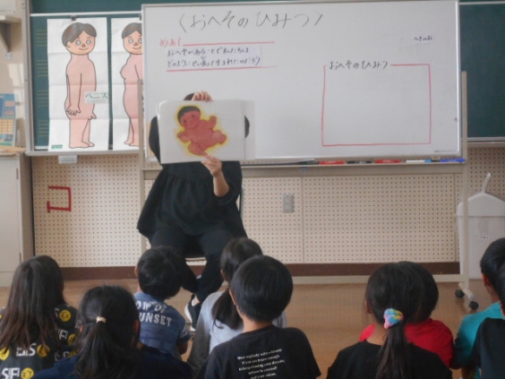 2年生が、養護教諭の小野先生から「おへそのひみつ」について教えていただきました。子供たちは、一人一人が小さな命から始まり、お母さんのお腹の中で大切に育てられる間、へその緒を通して栄養が送られていることを知りました。紙芝居や絵を使っての説明でしたのでとても分かりやすく、子供たちはしっかり話を聞いていました。おへそは、お母さんと繋がっていた証拠で、命の源であることを知った子供たちは、あらためて感謝の言葉を口にしていました。