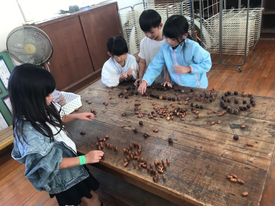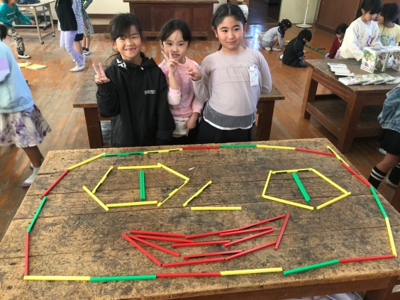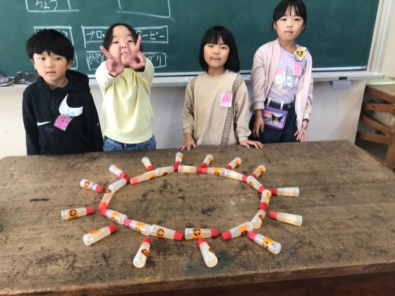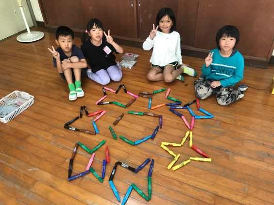 1年生が図画工作科の「ならべて ならべて」の学習で、いろんな物を並べて自分たちの表現したいものをつくりました。使った物は、身近にあるマジック、のり、ノート、筆箱、数え棒、どんぐり、数字カードなどです。並べる方向を考えたり、色の違うものは組み合わせを考えたりと、グループの友だちと交流しながら楽しく活動しました。出来上がった時は、どのグループも満足そうでした。片付けも協力してできました。