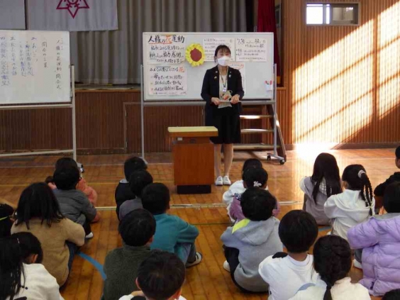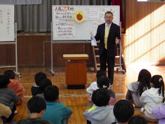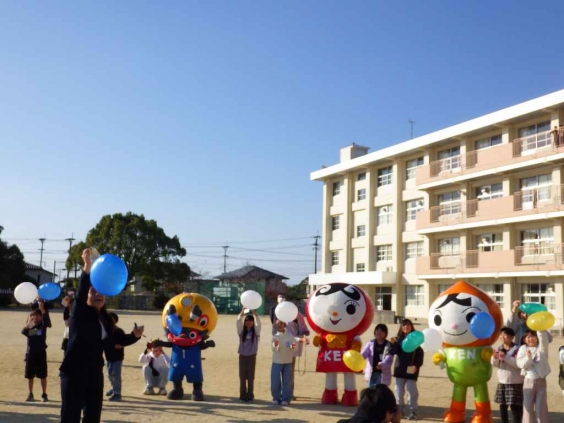 この写真は、先週3年生が「人権の花運動」の閉会式を行った時のものです。当日は、福岡法務局柳川支局長 開田様、大牟田市教育委員会教育長 谷本 様からご挨拶をいただいたり、自分たちが育てたひまわりの種をエコ風船で飛ばしたりと、盛大な閉会式となりました。ジャー坊や人権のイメージキャラクター まもる君・あゆみちゃんにも会え、子供たちは大喜びでした。お世話をして育てたひまわりの種が、どこかの誰かの手元に届き、命のリレーが繋がると嬉しいです。