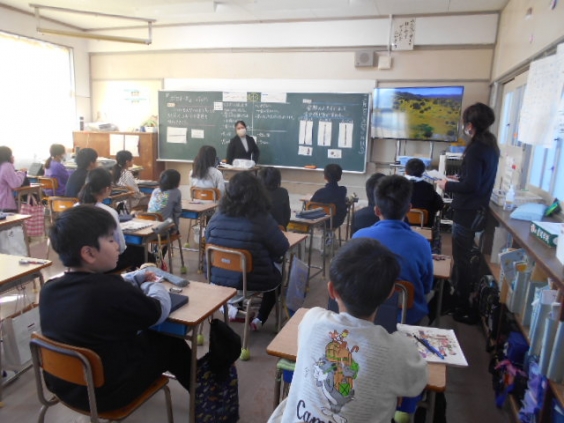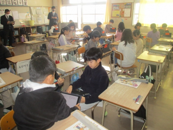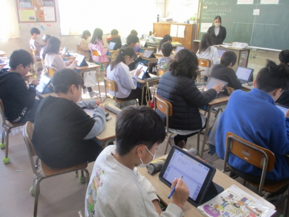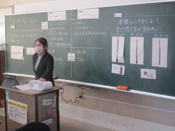 初任の江口先生のために、藏座先生が音楽の授業を見せてくださいました。鑑賞の学習を進める中で、解説書に基づいた鑑賞の視点の与え方や音楽用語の確実な定着などの様子を見せていただき、大変勉強になりました。効果的なICTの活用もあり、江口先生も学びが多かったようです。学習後の子供たちの振り返りでは、「バッハの他の曲を聴いてみたい。」「木管楽器で演奏された他の曲も聴きたい。」と興味・関心が広がった意見が多く見られました。知的好奇心を高める学習をしてくださった藏座先生、ありがとうございました。