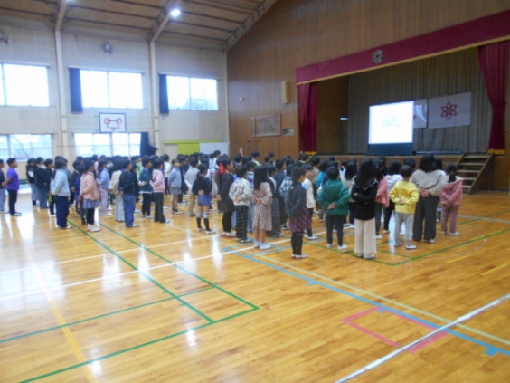 86日間の後期前半が終わりました。全校朝会では、校長先生から「自分を振り返ることの大切さ」「日本の文化に触れよう」というお話がありました。また、「一年の計は元旦にあり」を引用され、計画をしっかり立てることが肝心であることも話していただきました。最後に、昨日の久留米での自転車事故について話され、「必ず生きて冬休み明けに再会しましょう。」と力強く話されました。