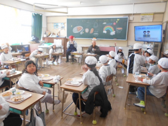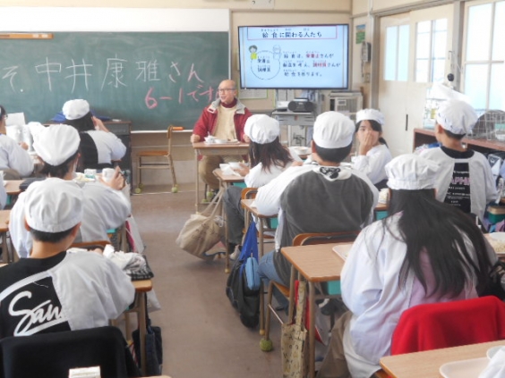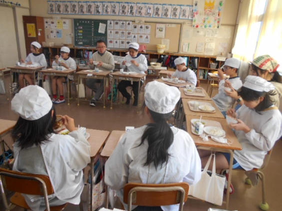1年生との昔遊び交流を行った後、見守り隊の皆さんに給食試食会に参加していただきました。まずは、栄養教諭の竹下先生から、給食の意義や役割、美味しく食べてもらえる工夫などについてお話がありました。その後、各教室で給食を食べていただき、一緒に食べた子供たちはとても楽しそうでした。この日のメニューはハヤシライスで、ルウを使わずに作られる美味しいハヤシライスに舌鼓を打たれていました。