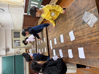 「いらっしゃい、いらっしゃい、いろんな品物がありますよ。」1年生の元気な声が響きます。これは、国語科「ものの名前」の学習で、店員とお客さんになって会話のやり取りをしたり、ものの名前に触れたりする学習です。子供たちは、「くだもの」や「がっき」などまとまりを表す言葉と「りんご」や「ラッパ」など物の一つ一つを表す言葉を、お店屋さんの活動を通して学びました。また、買い物をして集めたカードは自宅に持ち帰りますので、「やったぁ、家でもお店屋さんごっこをしよう。」と、みんなとても嬉しそうにしていました。
