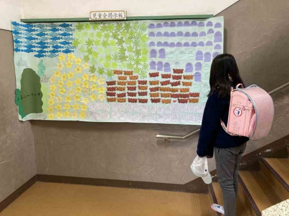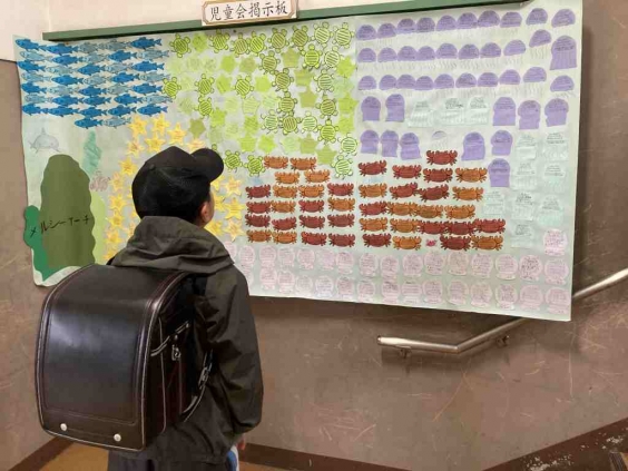 階段の掲示板に貼られたメルシーアーチ。企画委員会が決めた今回のテーマは海です。ありがとうの言葉が海の生き物に書かれ、明るく賑やかな掲示物に仕上がりました。階段を通る時に、「自分のがあった。」「〇〇さんの見つけた。」と見ている子供たち。見て楽しい、読んで嬉しいメルシーアーチになりました。計画や準備をしてくれた企画委員会のみなさん、ありがとうございました。