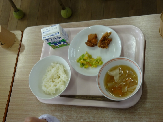 ピカピカの小学1年生が、待ちに待った初めての給食を迎えました。 大きな食缶や食器、牛乳などを、みんなで力を合わせて慎重に教室まで運びます。「こぼさないように」と緊張しながら用意したメニューは、大人気のから揚げにワンタン汁、野菜ソテー、ごはん、牛乳。 自分たちで準備したからこそ、おいしさもひとしおです。教室中に「おいしい!」笑顔が広がり、心もお腹も大満足の給食デビューとなりました。