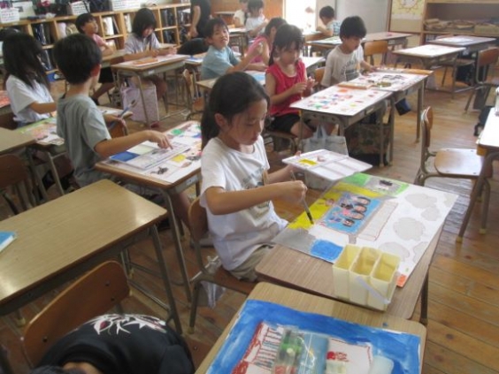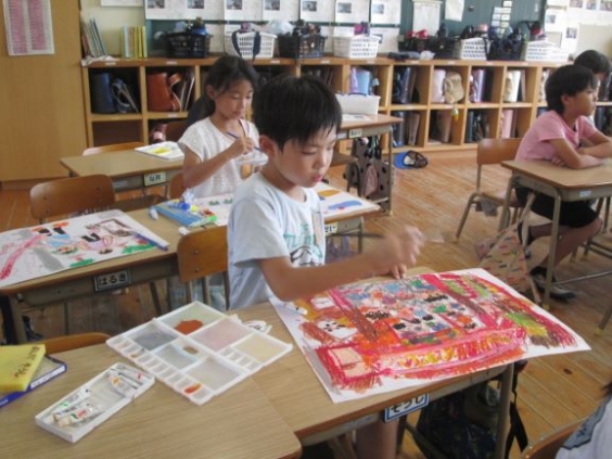 本日5校時に2年生が図画工作科「こんなことあったよ」の学習をしました。夏休みにみんなでプールや海に行ったことやバーベキューをしたこと等、楽しかった思い出を画用紙いっぱいに絵で表現していました。