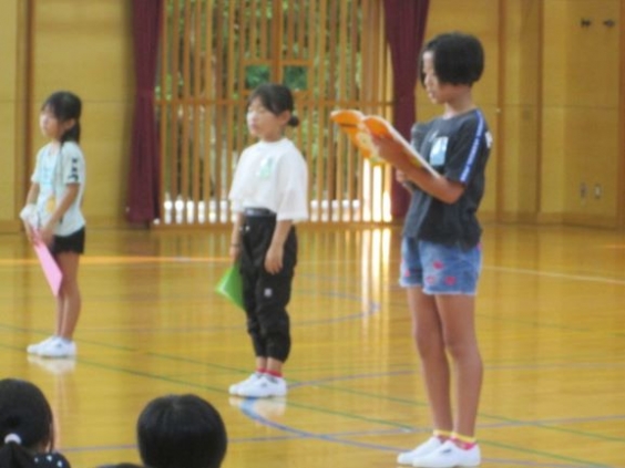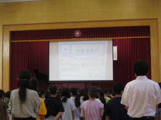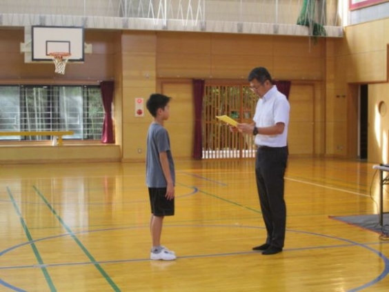 本日、前期終業式を行いました。はじめに、6年生の代表児童に「通知表わたし」がありました。次に、校長先生から「かしこく」「やさしく」「たくましく」の振り返りと評価についてと安全に過ごすために守ってほしいことの話がありました。式に引き続き、各学年の児童代表が「前期頑張ったこと」の発表をしました。後期も、お互いのいいところを認め合って、みんながニコニコになるように力を合わせて頑張ってほしいと思います。