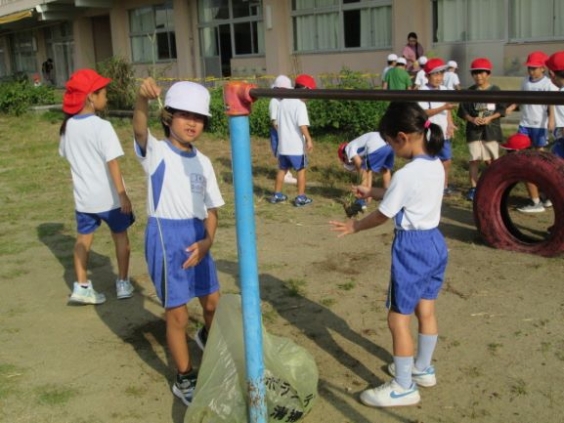 朝の活動の時間に、全校児童で運動場の整備と草取りをしました。各学年の担当場所に分かれてみんなで協力して行いました。