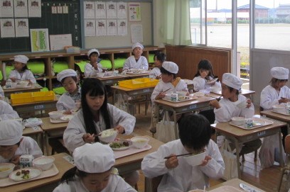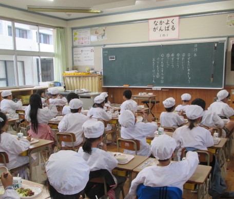 運動会まであと2日間の練習となりました。明日、全体練習の3回目を行います。今日も全学年、演技の仕上げを頑張っていました。また、今日の給食は和食の日の献立で、「ごはん、五目汁、肉団子のうま煮、キャベツの昆布和え」でした。1年生は「おいしいね」と言いながら、よく噛んで、もりもり食べていました。栄養をたくさんつけて本番に向けて頑張ってほしいと思います。運動会当日も給食があります。