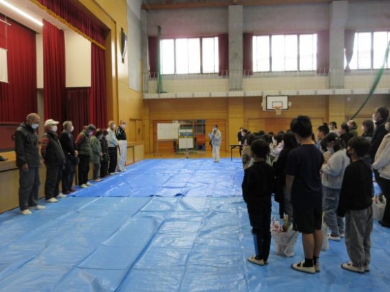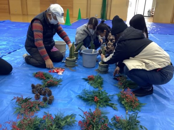 本日、3,4校時に3年生が親子学習会で地域の方とミニ門松作りをしました。竹の組み方や飾りつけの場所などを教わり、難しい作業は一緒にしていただきました。地域の方々には、竹や石、松ぼっくりなどの材料の準備や下ごしらえもしていただきました。本当にありがとうございました。完成したミニ門松の一部は、先日花いっぱい運動で植えたチューリップとビオラのプランターと一緒に校区の公共施設、介護施設にお配りする予定です。