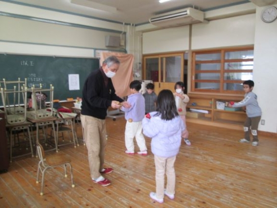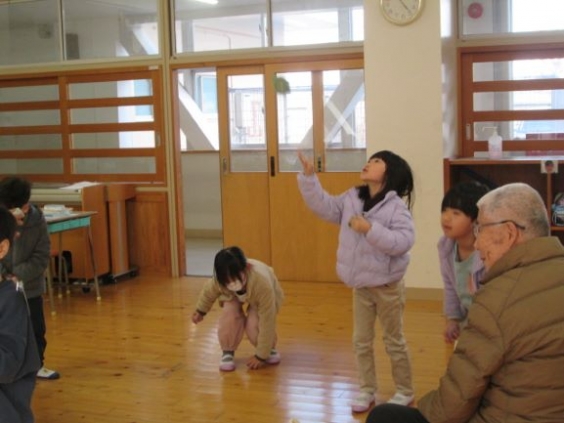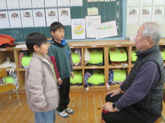 1年生が昔遊び体験をしました。まちづくり協議会を中心にたくさんの地域の方々にも参加していただきました。「お手玉」「おはじき」「あやとり」「だるまおとし」「けん玉」のコースを順に回りました。遊び方のコツを教えていただいたり、手を取って教えていただいたりしながら、楽しく体験をすることができました。ご指導いただきました地域の方々、ありがとうございました。