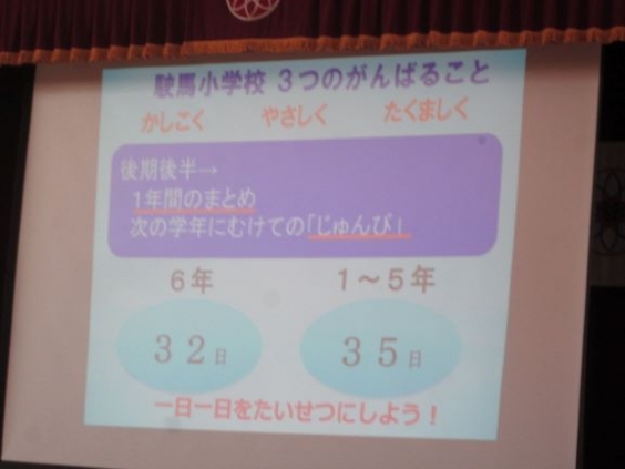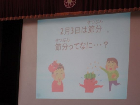 本日、2月の全校朝会を行いました。はじめに「かしこく」「やさしく」「たくましく」に向けた取組の振り返りを行い、達成状況と2月に頑張ることを全校で確認しました。また、2月3日の節分と2月4日の立春の説明を校長先生から説明していただきました。心の鬼を追い払い、みんながニコニコになれるように、心を合わせて頑張っていきたいと思います。