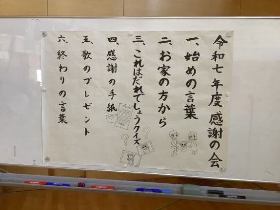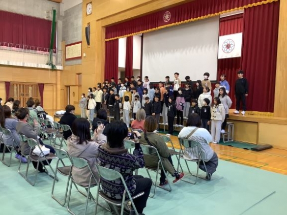本日6年生がお家の方をお招きして、「感謝の会」を5,6校時に行いました。スクリーンに映し出された小さい頃の写真を見て友達の名前を当てたり、子どもたちからお家の方へ感謝の手紙を渡したりして、楽しい時間を過ごしました。最後に歌のプレゼントもしました。お家の人に対する感謝の心にあふれる会になりました。